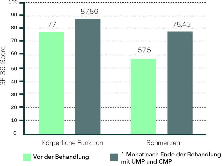 Speziell die Nukleotide Uridinmonophosphat (UMP) und Cytidinmonophosphat (CMP) zeigten bei Patient:innen mit Karpaltunnelsyndrom eine Verbesserung der körperlichen Funktionsfähigkeit und der Schmerzen (s. Abb. Diagram)