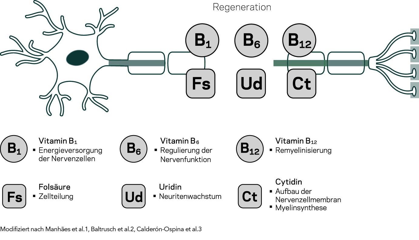 Für die Funktion und Regeneration von Nervenzellen sind bestimmte Stoffe wichtig. Dazu gehören Vitamin B1, Vitamin B6 und Vitamin B12, Folsäure, Magnesium und Nukleotide wie Uridin- und Cytidinmonophosphat.